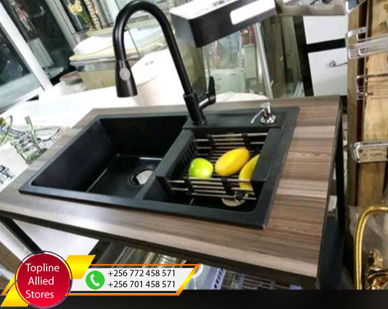 Hand Made Kitchen Sink with a Black Mixer in Uganda, Sanitaryware, Toilet & Bathroom Accessories in Uganda, Topline Allied Stores Uganda for Supply of: Plumbing Materials, Building Materials, Kitchen Furnishing, Tiles, Ceramics and General Hardware in Nakasero Kampala Uganda, Ugabox
