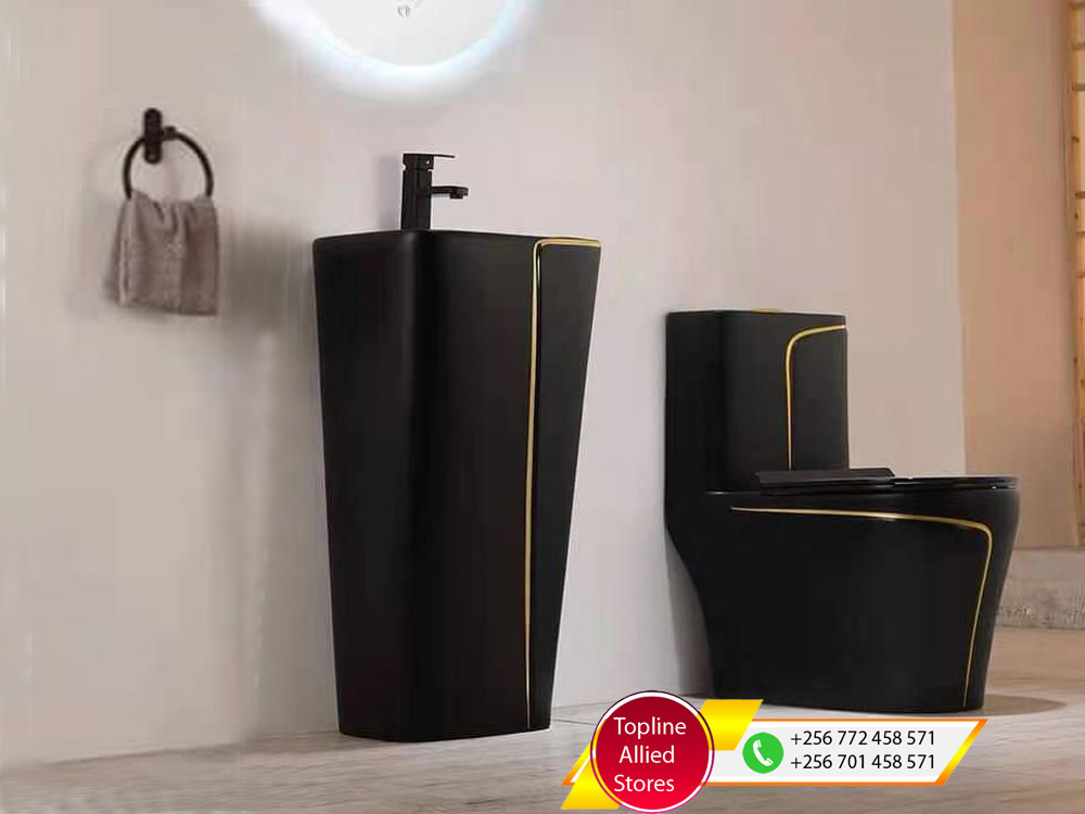 Luxury Ceramic Black Set (Wash Hand Stand/Black Pedestal Basin And Toilet) for sale in Uganda, Modern Toilet And Bathroom Fittings and Accessories in Uganda, Topline Allied Stores Uganda Services: Toilets, Kitchen Sinks, Wash Basins, Sanitary Ware And Fittings. We stock the following products: Tiles, Bathtubs, Mirrors, Toilet Seats, Button Flush Toilets, Urinals, Wash Basins, Kitchen Taps, Kitchen Sinks, Shower Systems, Bidets and lots more Sanitary products. Our Hardware Shop is located in Nakasero below Nakasero Market, Kampala Uganda, Ugabox